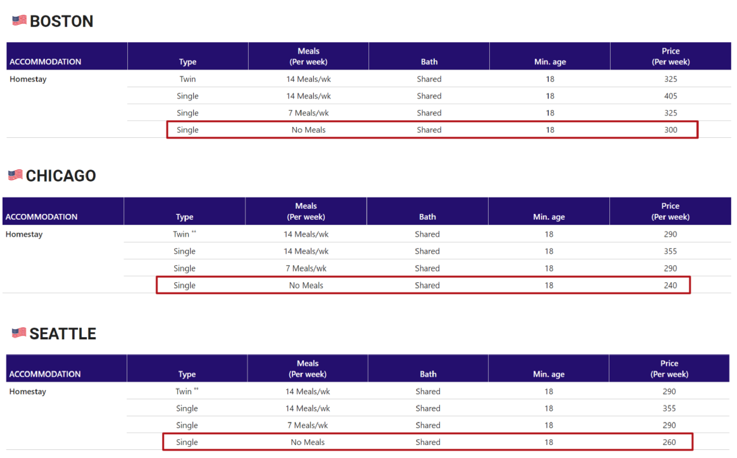 그럼 여기서, 미국 세 도시의 2024년도 홈스테이 비용표를 통해 싱글룸 주당 14식을 기준으로 한 일반 홈스테이와의 가격 차이를 체크해 보겠습니다.