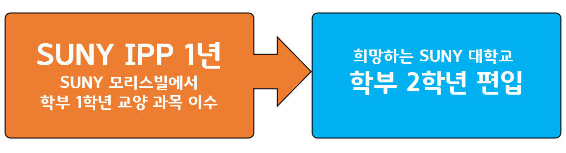 SUNY IPP를 통한 편입 루트 및 입학 조건 SUNY IPP 1년(2학기~3학기) 수강 → 희망하는 SUNY 대학교 2학년 편입