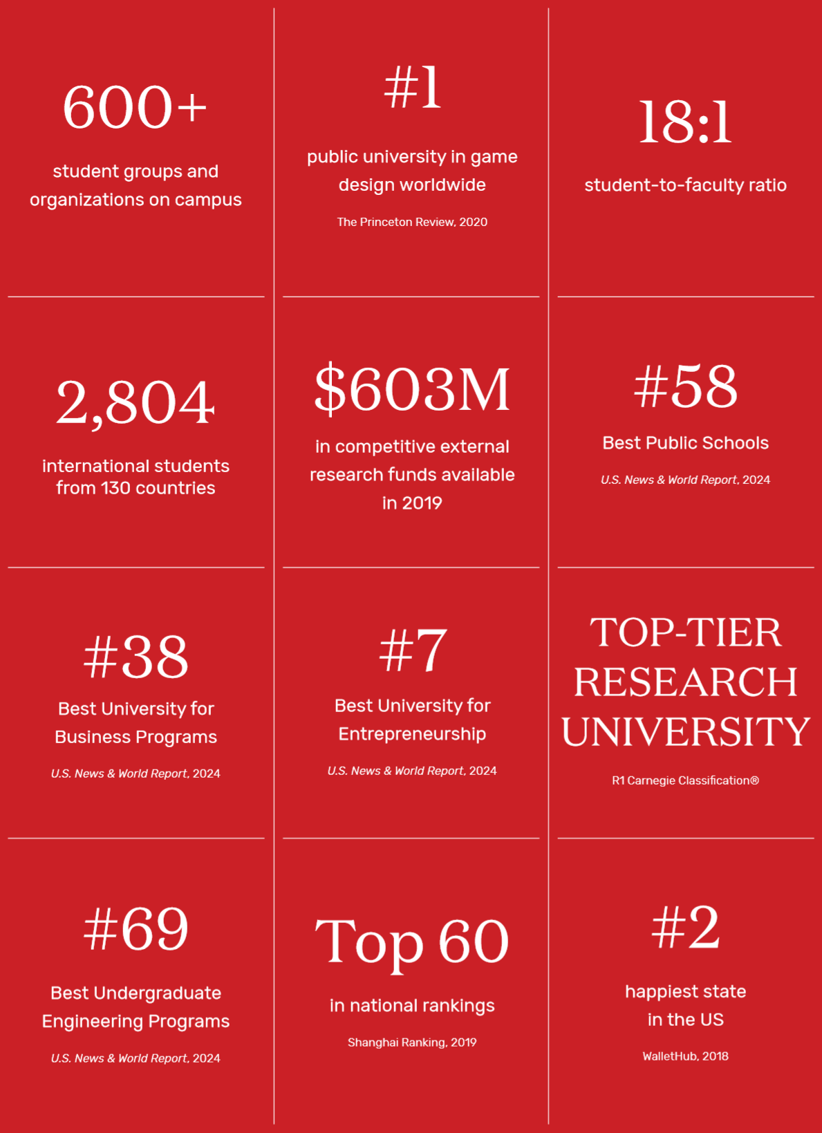 2024 전미 종합대 랭킹 105위*로, 총 32,994 명 학생이 재학 중이며 국제 학생 비율은 4.5%선 입니다.