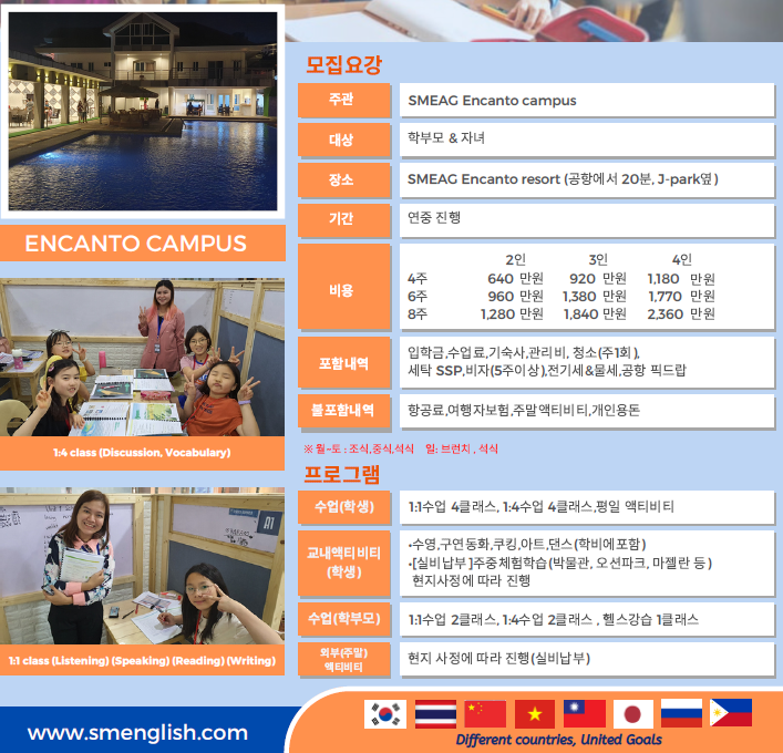 SMEAG 엔칸토 리조트는 필리핀 세부에서 가족 캠프와 어학 연수를 즐길 수 있는 곳으로, 다양한 활동과 숙박 시설을 제공합니다.