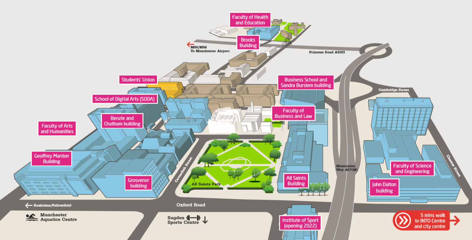 맨체스터 메트로폴리탄 대학교의 캠퍼스 구성을 간략히 살펴보면, 올세인츠 캠퍼스는 교육대학을 제외한 인문, 어학, 사회과학 계열 등 대부분의 학부가 자리하고 있으며 예술대학이 전체 캠퍼스의 가장 큰 부분을 차지하고 있는데, 맨체스터 대학 (University of Manchester)과 공동 운영하는 건축대학과 올몬드 빌딩, 세딥스버리 캠퍼스, 브룩스 빌딩, 비즈니스 스쿨 등이 있습니다.