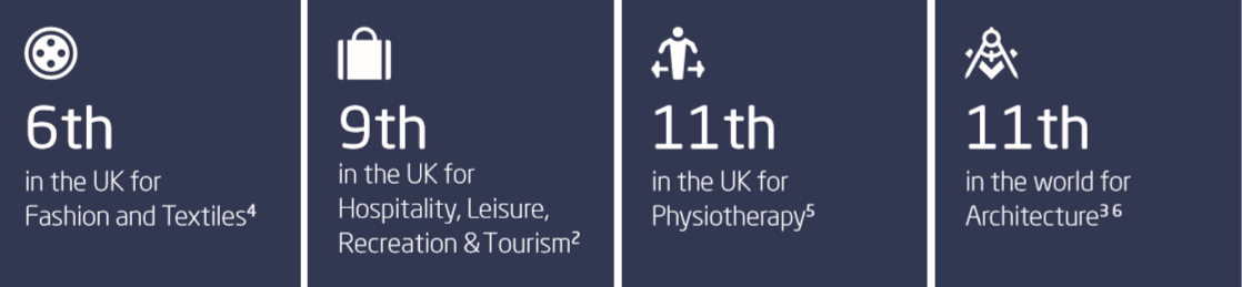 영국 상위 20위내 전공 14개를 보유하고 있는 맨체스터 메트로폴리탄 대학교 학과 경쟁력을 살펴보면 아래와 같으며 2021년 세계대학 전공순위 (QS World University Rankings by Subject) 는 건축학이 11위를 차지했고, 패션 학과는 2018년 Business of Fashion 에서 세계 39위로 선정된 바 있습니다.