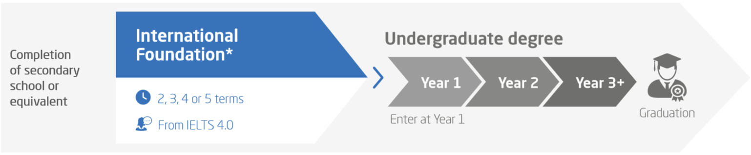 한국의 고교 졸업생 입장에서 보면 4년만에 영국 학사학위를 취득한다면 영국 학생과 동일한 총 16년의 학업 기간이 소요되므로 현실적으로 내신과 공인영어 점수가 신입학 요건에 맞더라도 대부분의 국제학생의 영어 수준에서 풀타임 학부 수업을 소화하기에 부족한 영어를 보완하는 시간으로 채울 수 있는 학부 예비과정인 파운데이션 프로그램을 통해 온전한 학사학위 취득을 위한 경쟁력을 키우는데 초점을 맞추는 것이 현명한 방안일 것 입니다.