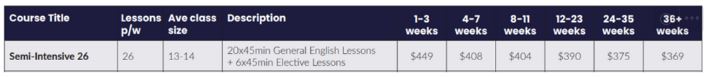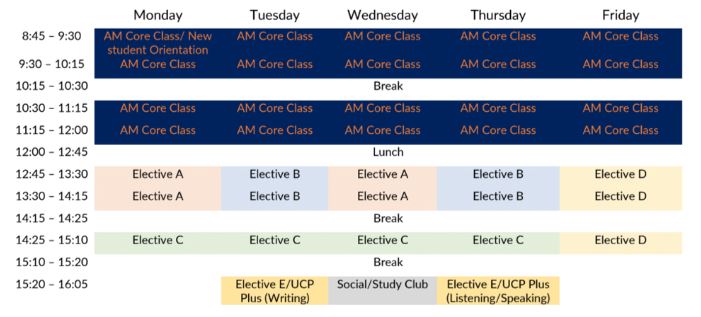 -$449 40주 = CAD$14,760 교재비 레벨당 CAD$130 4개 레벨 = CAD$520 총 비용 CAD$15,455 ▶ 샘플 시간표